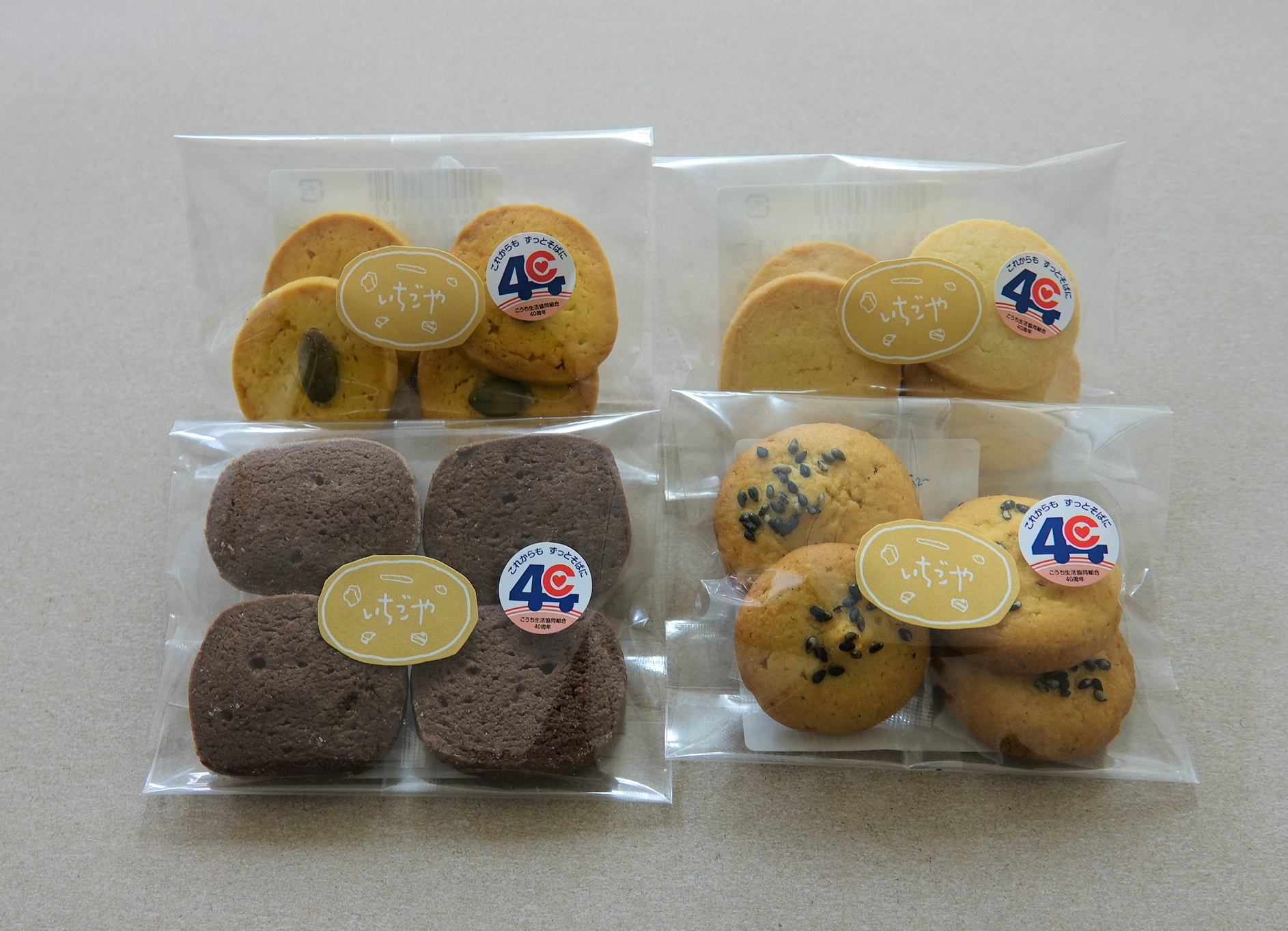 高知の食材を塩クッキー、しょうがココアクッキー、さつまいものクッキー、かぼちゃのクッキーと4種類のクッキーに仕上げました。