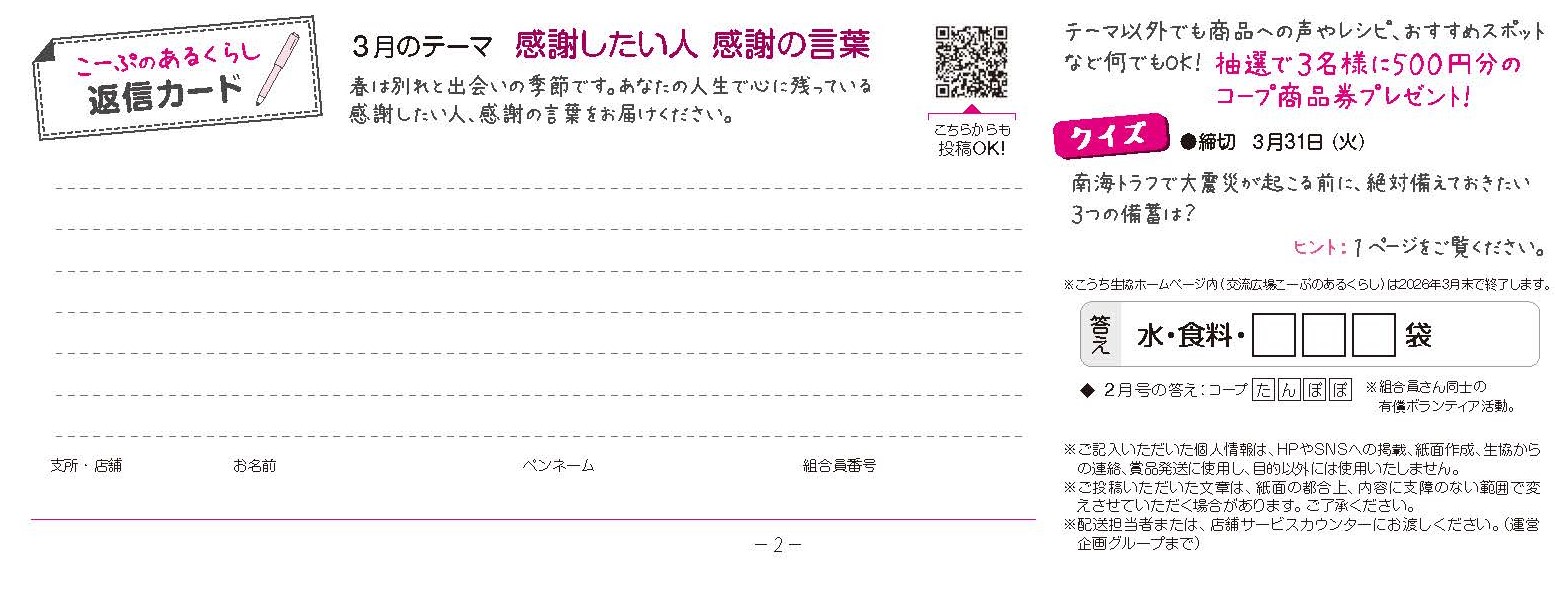 春は別れと出会いの季節です。あなたの人生で心に残っている感謝したい人、感謝の言葉をお届けください。※交流広場『こーぷのあるくらし』は2026年3月末で終了します。