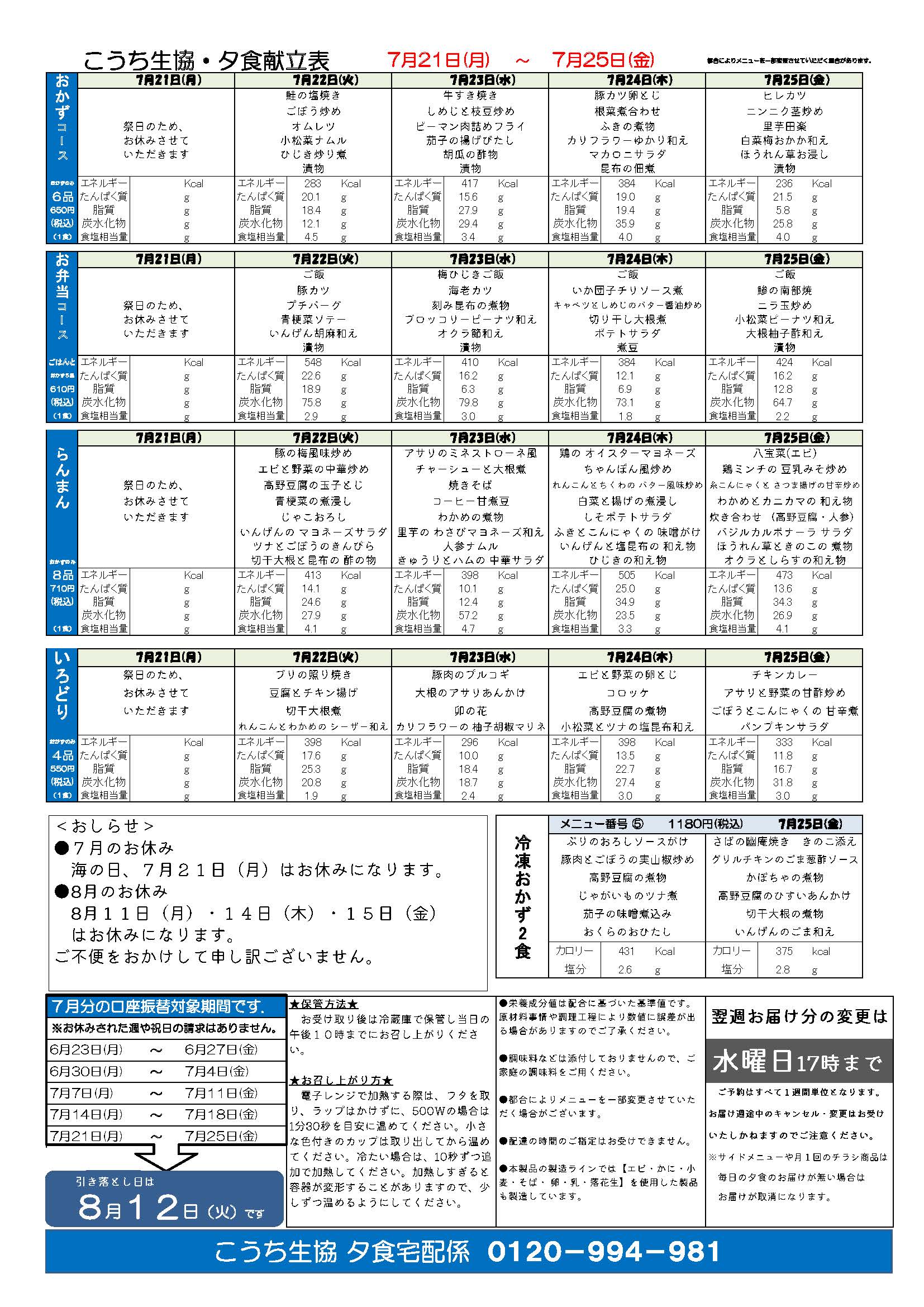 夕食宅配メニュー表(7月21日~7月25日)2025.07.07