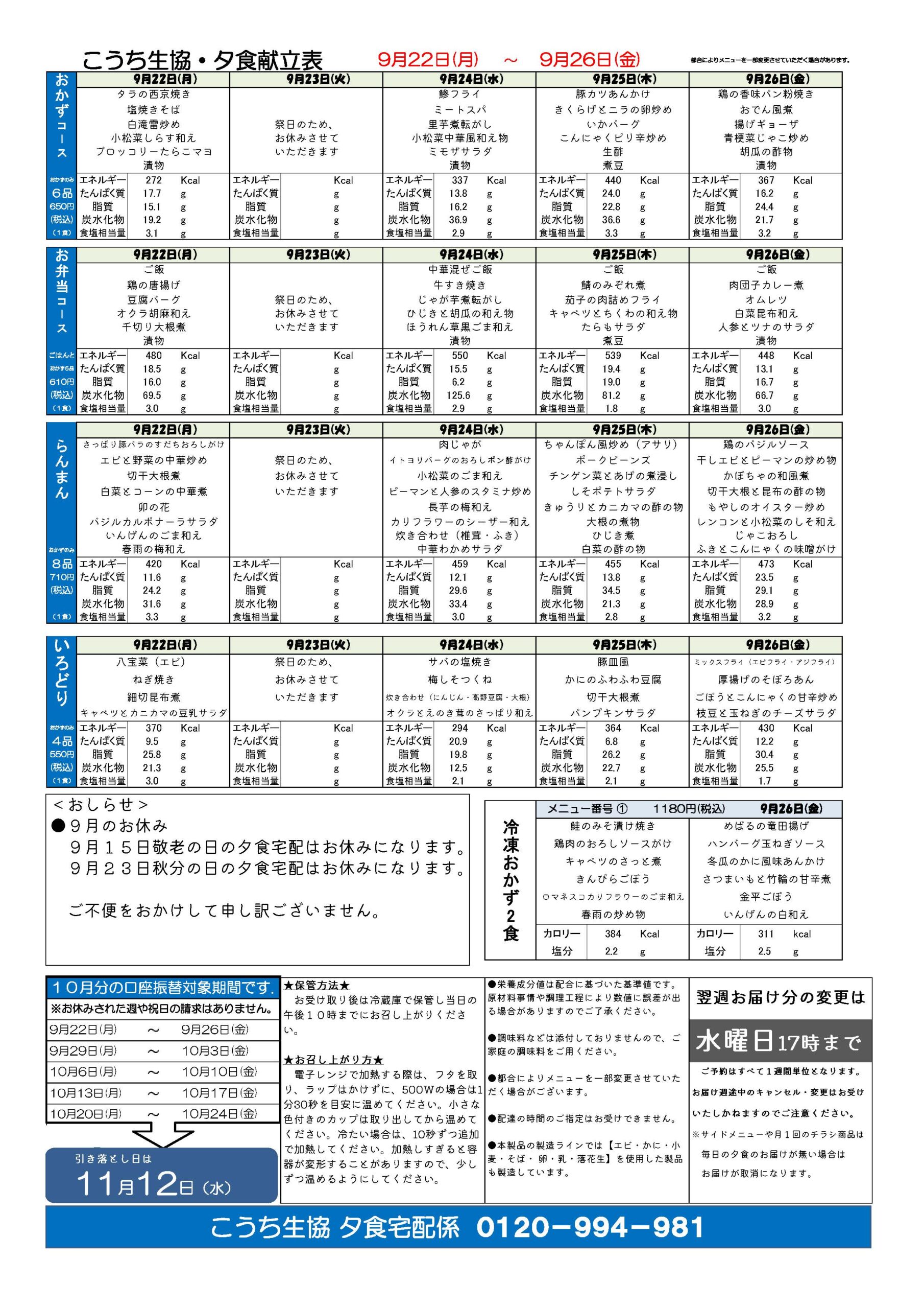 夕食宅配メニュー表(9月22日~9月26日)2025.09.08