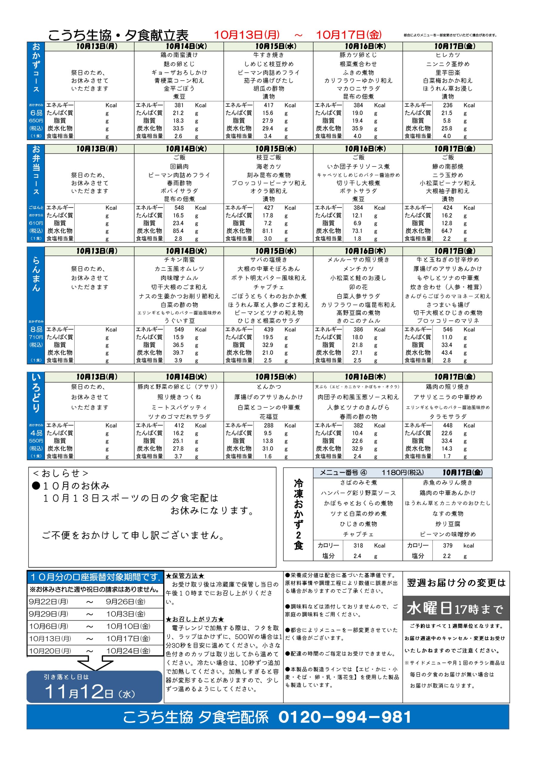 夕食宅配メニュー表(10月13日~10月17日)2025.09.29