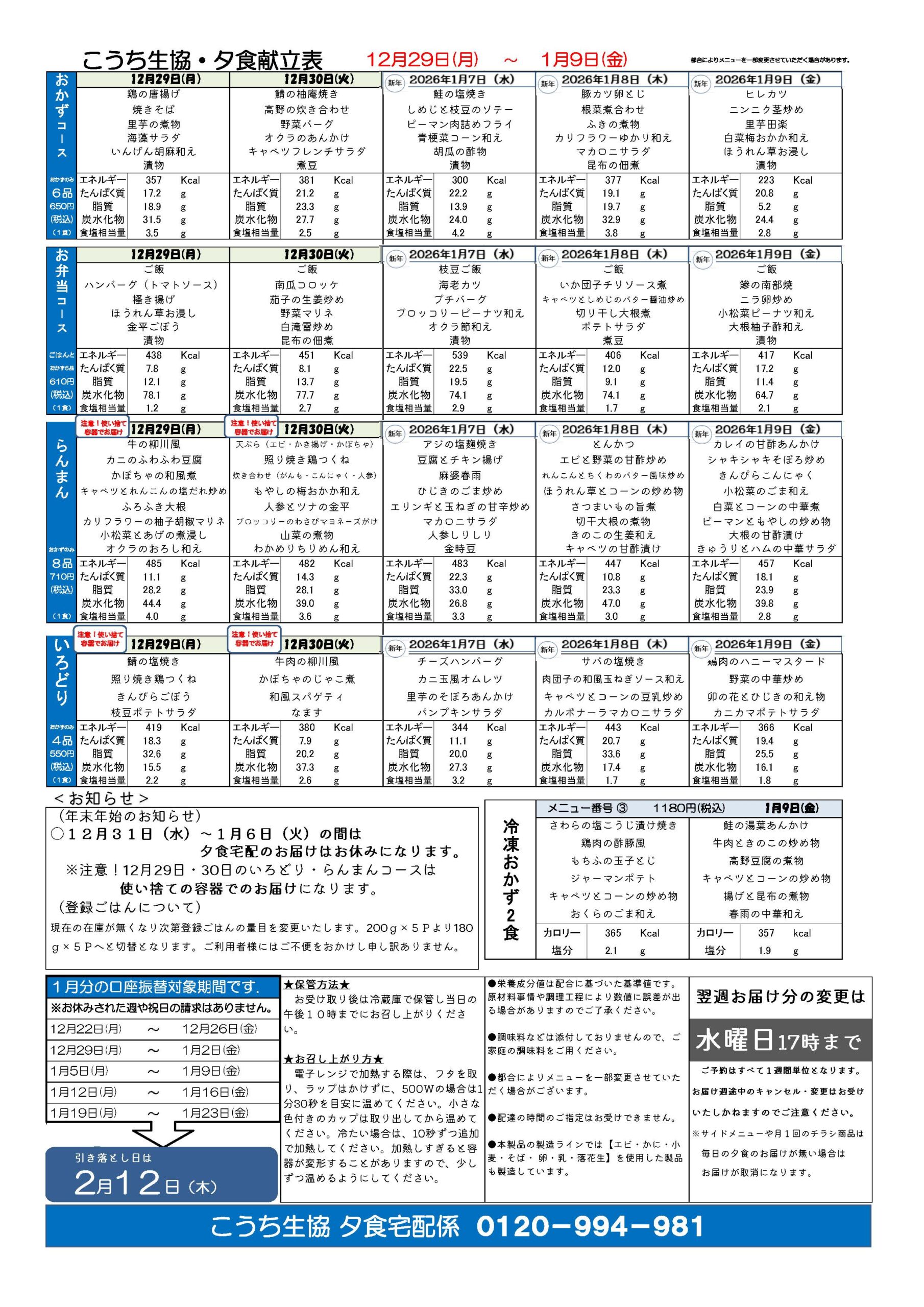夕食宅配メニュー表(12月29日~1月9日)2025.12.16