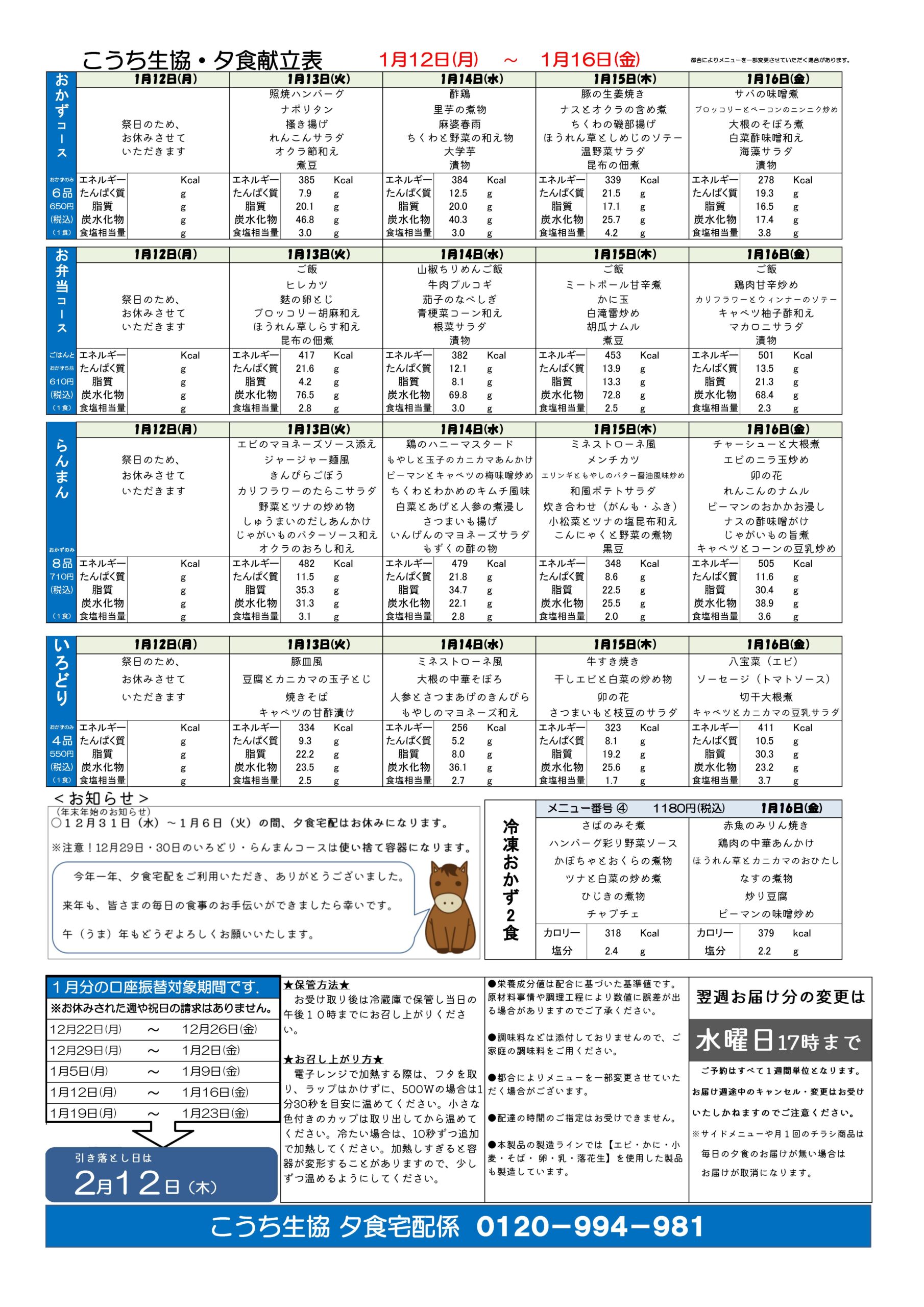 夕食宅配メニュー表(1月12日~1月16日)2025.12.23