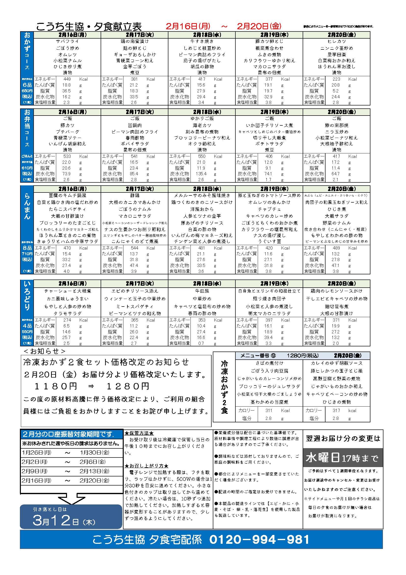 夕食宅配メニュー表(2月16日~2月20日)2026.02.03