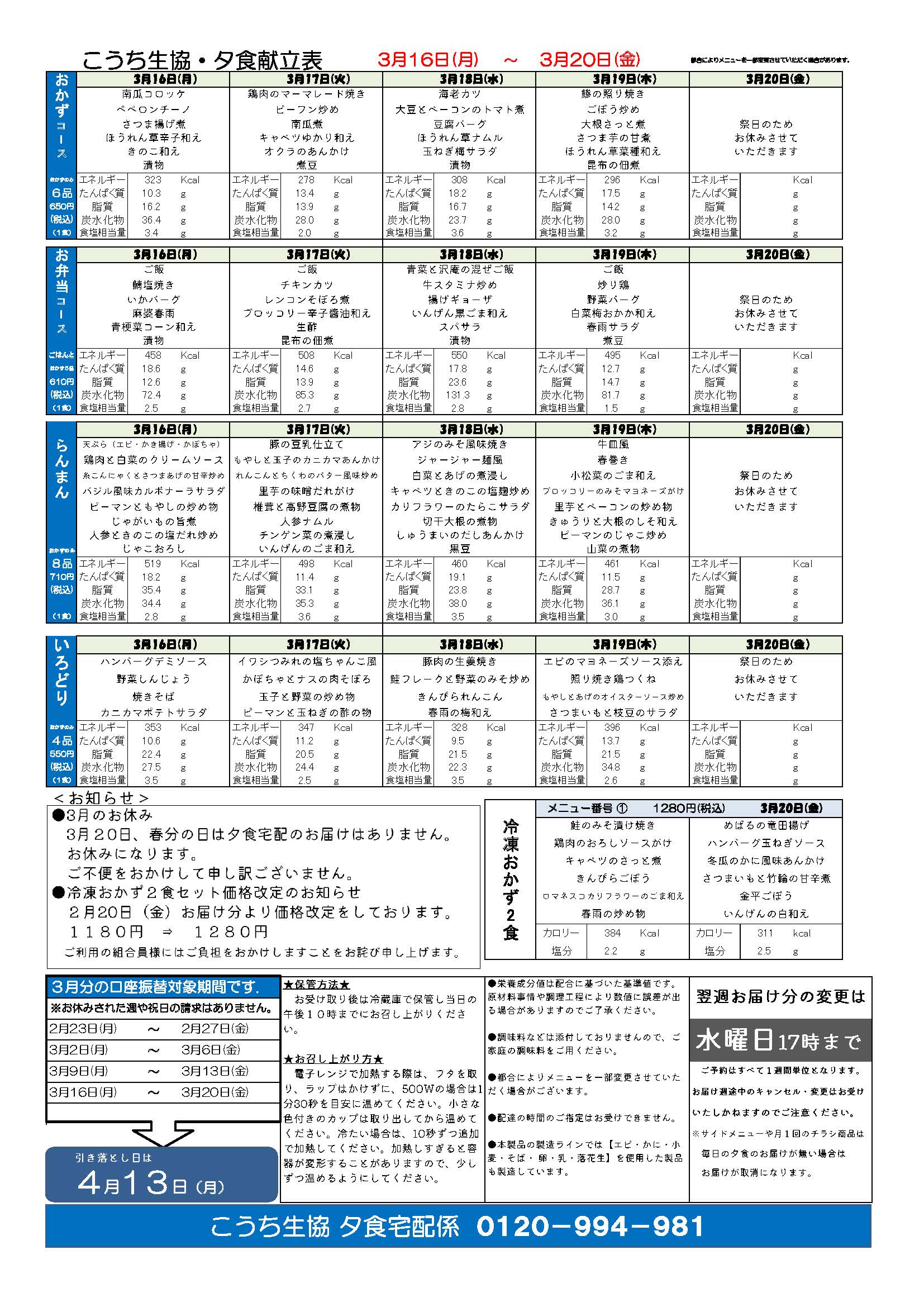 夕食宅配メニュー表(3月16日~3月20日)2026.03.02