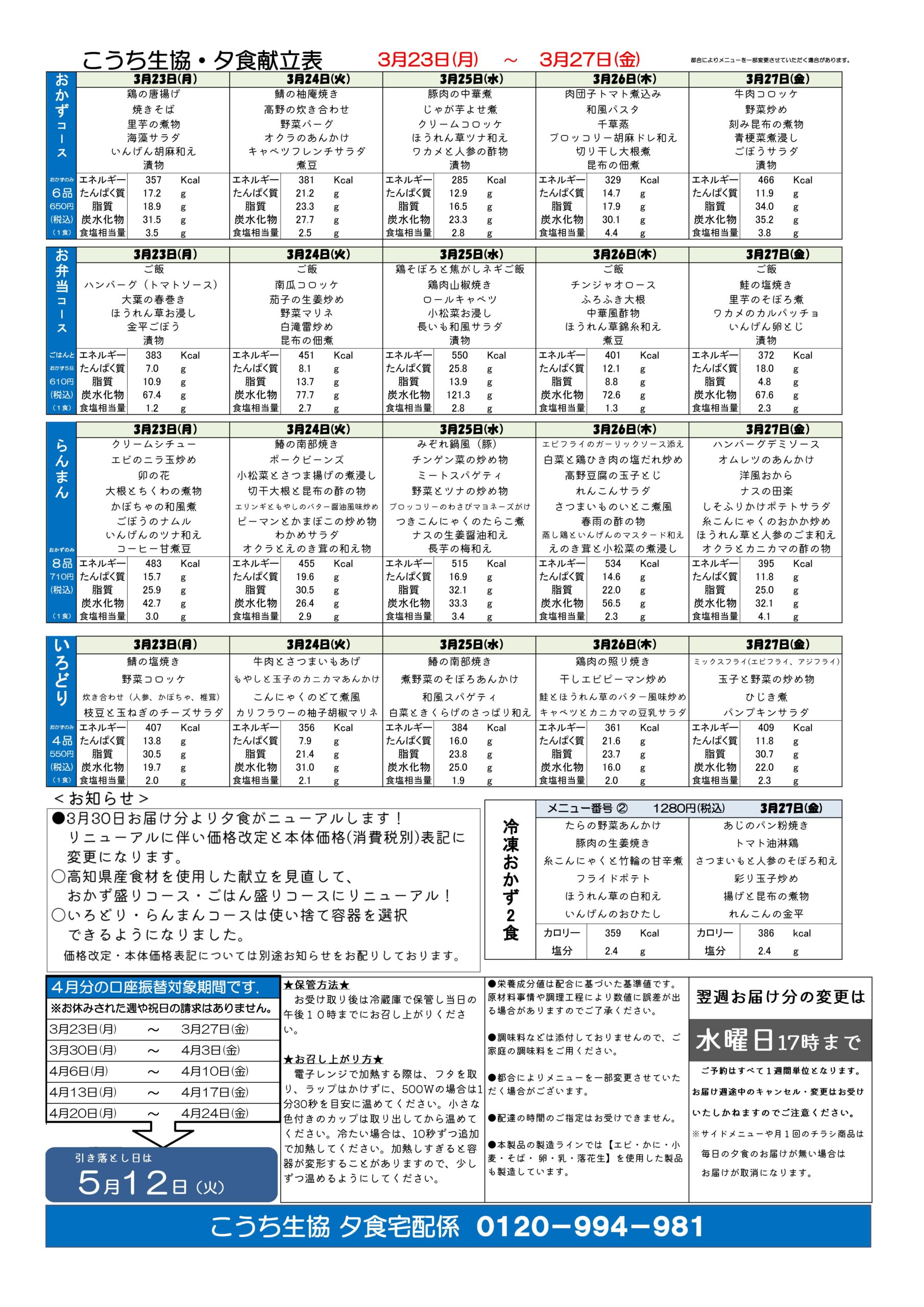 夕食宅配メニュー表(3月23日~3月27日)2026.03.09