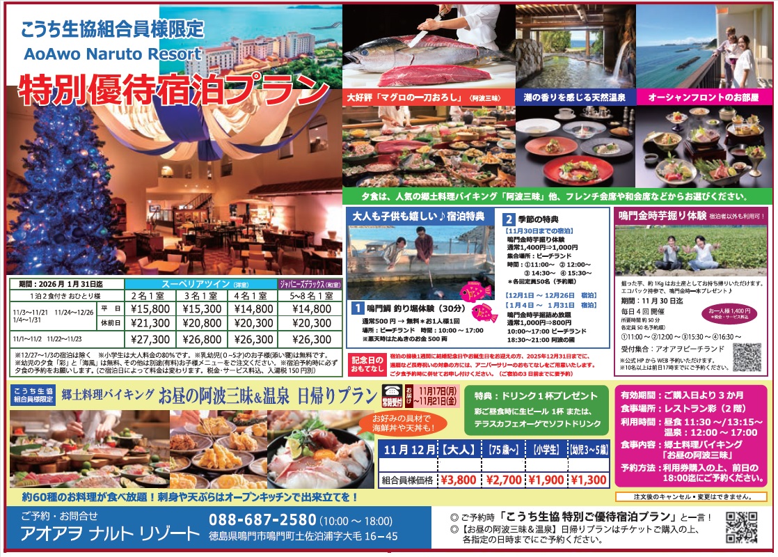 ■ 宿泊のご予約は、直接アオアヲ ナルト リゾートへお申し込みください。ご予約時、必ず組合員様名と「こうち生協 ご優待宿泊プラン」と一言!お願いします。