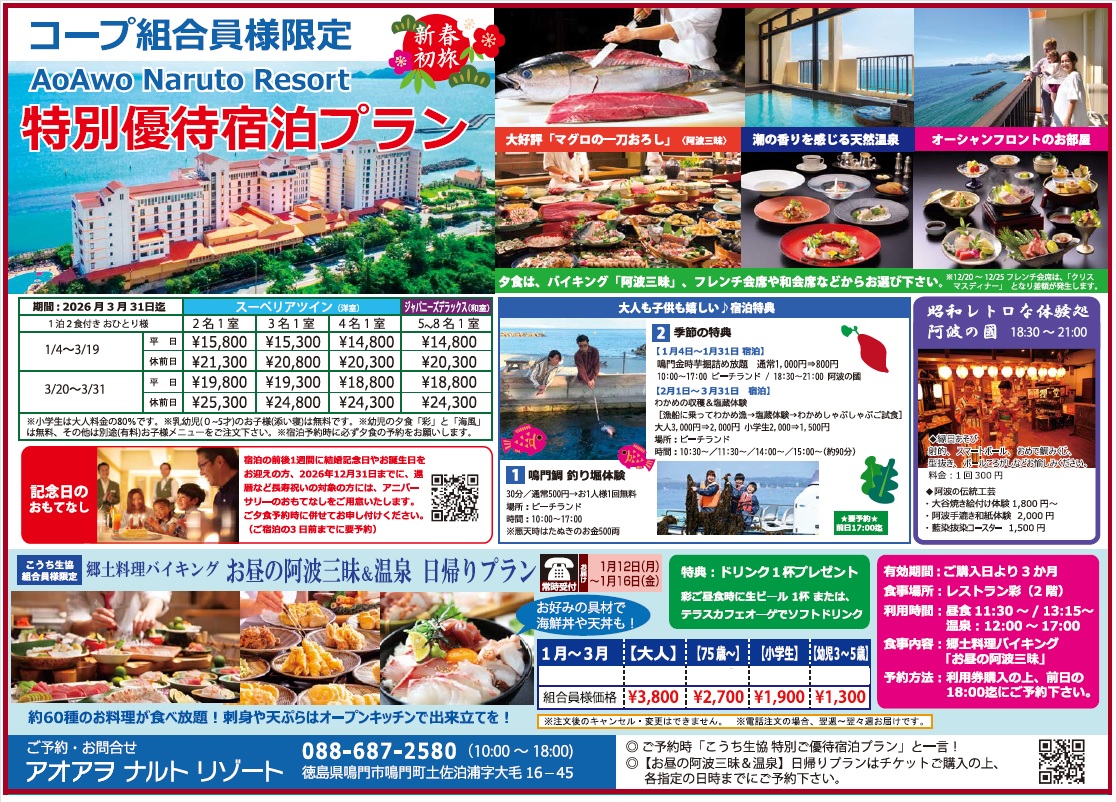 ■ 宿泊のご予約は、直接アオアヲ ナルト リゾートへお申し込みください。ご予約時、必ず組合員様名と「こうち生協 ご優待宿泊プラン」と一言!お願いします。