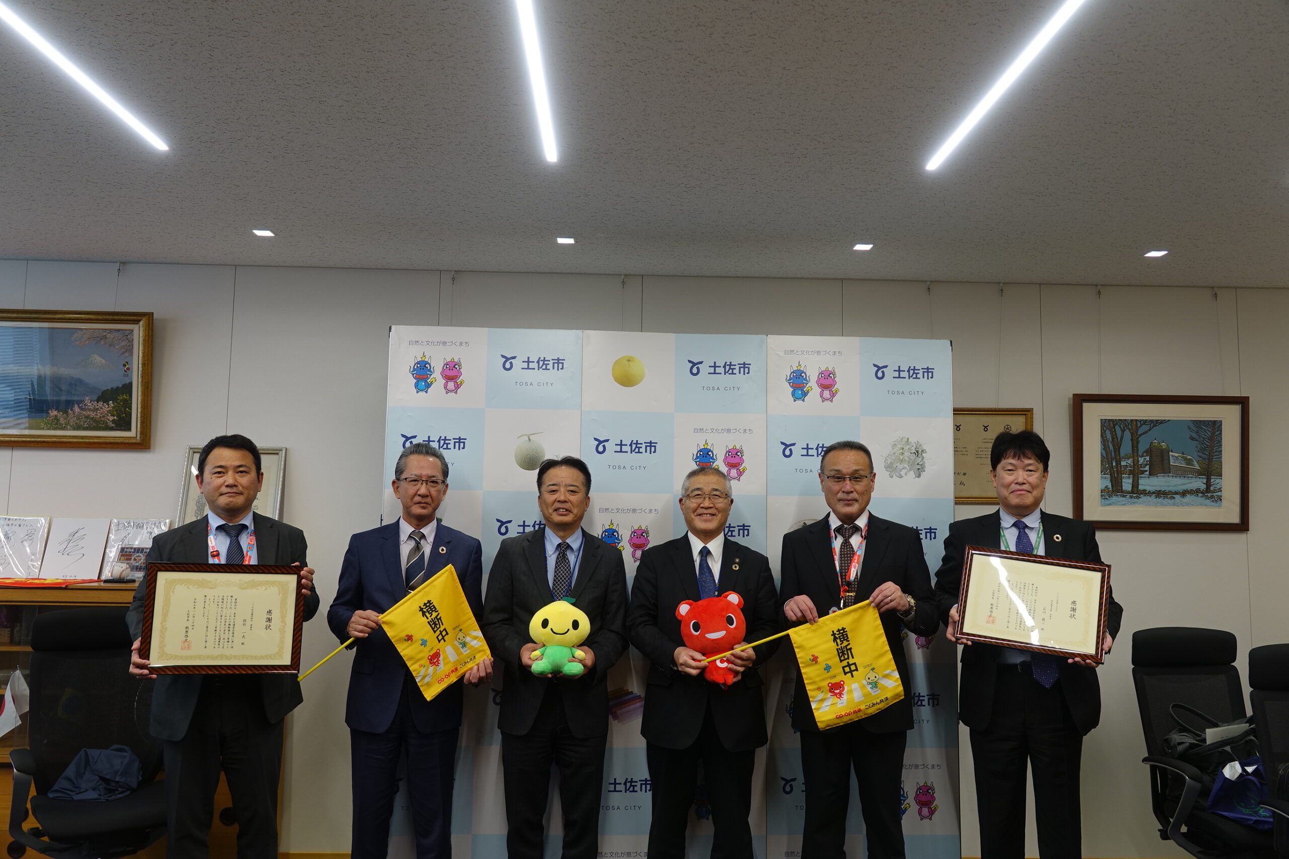 12月24日(水)「横断旗」の寄贈式が土佐市役所で行われました。土佐市長板原啓文様に森専務理事より60本の「横断旗」を寄贈され、土佐市からは感謝状をいただきました。「横断旗」は、こくみん共済coop公式キャラクター「ピットくん」とコープ共済オリジナルキャラクター「コーすけ」のコラボデザインです。